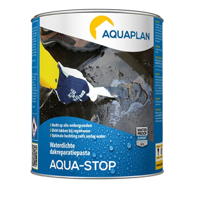 Aquaplan Aquastop is een waterdichte pasta voor het renoveren en tevens dichten van lekken in daken en goten onder alle weersomstandigheden, zoals bij regen, mist en vorst (zelfs onder water). Onmiddellijke hechting op verweerde dakbedekkingen, metalen en metselwerk belet dat het water verder kan infiltreren. Versterkt met vezels. Verbruik: afhankelijk van de aan te brengen laagdikte. Type : AS 1.